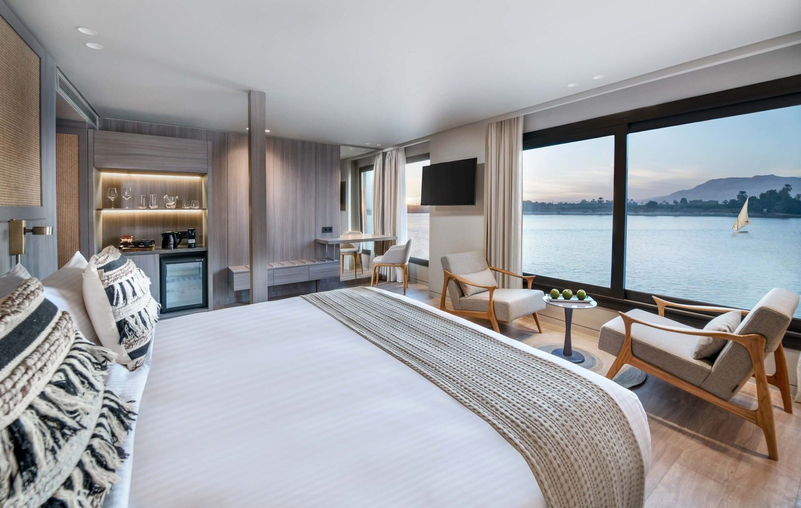 Historia Nile Cruise is a stunning blend of modern luxury and timeless elegance, offering a truly unique journey along the majestic Nile River. Designed to resemble a floating boutique hotel, this 5-star cruise ship combines contemporary comfort with elements inspired by Egypt’s rich heritage. Guests aboard Historia enjoy spacious cabins and suites with panoramic windows, fine dining experiences featuring local and international cuisine, and world-class amenities like a sun deck, pool, spa, and lounge bar.